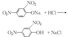 加入氫氧化鈉溶液后,保溫30分鐘,不斷攪拌至油層消失,水解反應(yīng)完成。靜置,冷卻,結(jié)晶至完全。將過(guò)濾后的2,4-二硝基苯酚鈉鹽用適量溫水溶解,然后加入 鹽酸化至pH值為1,析出2,4-二硝基苯酚: