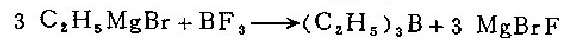 1.在裝有水銀密封攪拌器、回流冷卻器、滴液漏斗和導(dǎo)氣管的1升三口燒瓶中,加入72克(3.0克原子)鎂屑和250毫升無水丁醚。在氮氣保護下,慢慢加入500毫升含327克(3.0摩爾)乙烷的無水丁醚溶液,制得格氏試劑。反應(yīng)開始時非常劇烈,必須將燒瓶浸入冷水浴中冷卻,然后在4小時內(nèi)滴加400毫升含61克(0.9摩爾)三氟化硼的丁醚溶液。然后,在70℃加熱2小時。 (反應(yīng)完成后,將冷凝器換成磨口玻璃塞,將未密封的攪拌器換成短的分餾器。這種儀器的更換應(yīng)在快速氮氣流下迅速進行,以避免混合物暴露在空氣中)。直接蒸餾反應(yīng)混合物,收集94—97°c的餾分,可得到65克(74%)粗三乙基硼。