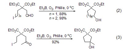 三乙基硼與氧結(jié)合,無需錫的參與,也能實現(xiàn)分子內(nèi)烷烴自由基與醛、酮的加成反應(yīng),例如 ω-碘醛在10倍三乙基硼的誘導(dǎo)下能有效地進行分子內(nèi)成環(huán)反應(yīng)(式2) [2], ω碘酮在20倍三乙基硼誘導(dǎo)下也能高產(chǎn)率地得到成環(huán)產(chǎn)物(式3)。