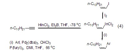 三乙基硼也可用于炔烴和烯烴的氫化銦化反應(yīng)(式4)[3]反應(yīng)生成的烯基銦可以與鹵代芳烴或其他親電試劑發(fā)生一步交叉偶聯(lián)反應(yīng)。
