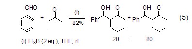 三乙基硼也可以取代金屬試劑實現(xiàn)串聯(lián)邁克爾-羥醛反應(yīng),合成 α-烷基-β高產(chǎn)率的羥基酮衍生物(式5)[4].