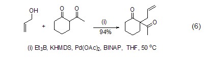 在鈀試劑催化的甲基化合物與不活潑的烯丙醇的烯丙基化反應(yīng)中,活性浸潤離子三乙基硼可以對烯丙醇的共鍵起到很好的促進作用(式6)[5].